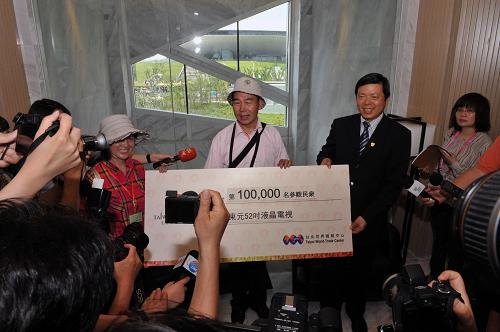 5月25日,第十萬名游客劉云祥(中)高興地接受記者采訪。新華社記者 何俊昌 攝