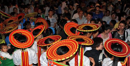 7月3日,湖南隆回花瑤婦女佩戴獨特的彩色花帶盤頭巾,引來眾多游客的關(guān)注。