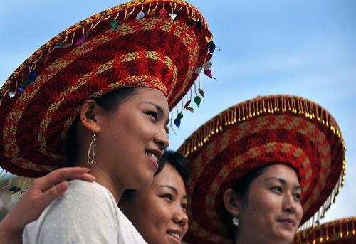 佩戴彩色花帶盤頭巾的湖南隆回花瑤婦女(7月3日攝)。
