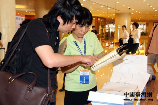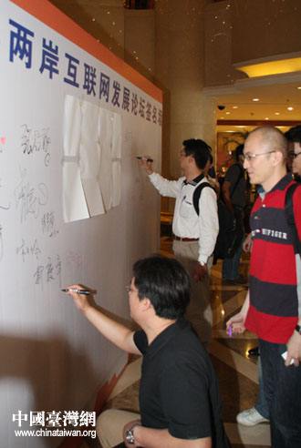 出席“2009兩岸互聯網發展論壇”的近百名臺灣嘉賓7月6日陸續抵達北京。圖為臺灣嘉賓在簽名墻上簽名留念。(中國臺灣網 鐘寶華 攝)