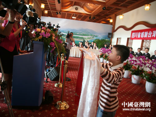 熱烈的掌聲中,四川6個地震重災市州的負責人和抗震救災小英雄林浩、著名藏族藝人容中爾甲、羌族藝人茍利芝代表災區人民為臺灣的參會代表獻上尊貴的哈達和羌紅,向所有去過地震災區施救的團體、組織,向所有關注、關心四川地震災區的臺灣同胞,表示誠摯的感謝和真誠的祝福。林浩和李月兩位小朋友分別用質樸的歌聲和深情的詩歌朗誦表達四川人民、災區人民對臺灣同胞的深深感激之情。