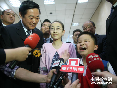劉奇葆在機場為大家介紹來自四川地震災區的小朋友林浩和李月。圖片來源:四川省臺辦