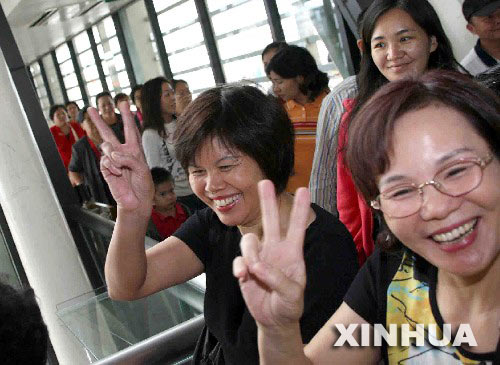 9月29日13時25分許,自臺北起飛的臺灣長榮航空公司BR1712航班,載著309位乘客抵達上海浦東國際機場。這是2006年兩岸中秋包機飛抵大陸的首個航班,標志著兩岸客運包機節日化的正式啟動。(新華社記者 張明 攝)