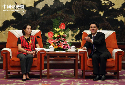 高金素梅同中國青少年發展基金會負責人賀軍科探討青少年教育問題。(中國臺灣網 鐘寶華 攝)