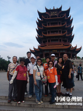 臺灣參訪團成員在黃鶴樓前合影留念。(攝影:陳寧)