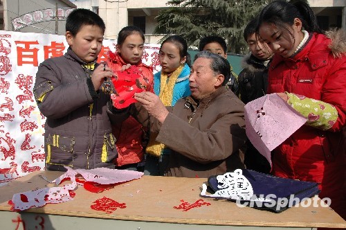 1月6日,河南省南陽市臥龍區陸營鎮一中退休教師呂登閣和學生們一起創作剪紙作品《百虎迎春》,迎接即將到來的農歷虎年。