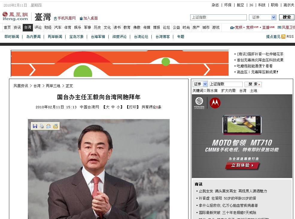 2010年2月11日,中共中央臺(tái)辦、國(guó)務(wù)院臺(tái)辦主任王毅通過(guò)中國(guó)臺(tái)灣網(wǎng)向臺(tái)灣同胞拜年。(中國(guó)臺(tái)灣網(wǎng) 田云鵬 攝)