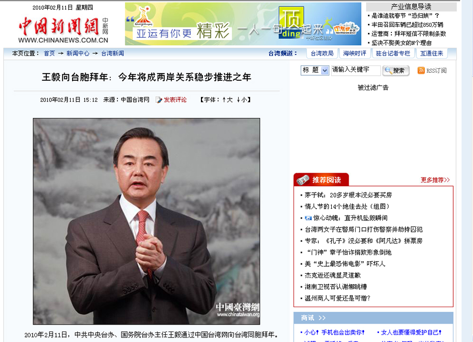 2010年2月11日,中共中央臺辦、國務院臺辦主任王毅通過中國臺灣網向臺灣同胞拜年。(中國臺灣網 田云鵬 攝)