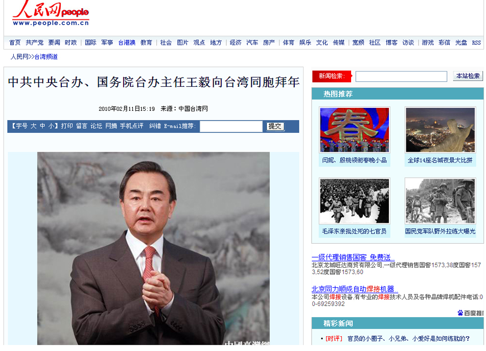 在虎年春節來臨之際,中共中央臺辦、國務院臺辦主任王毅于2月11日,通過中國臺灣網,向臺灣同胞拜年,祝福臺灣同胞新春愉快,萬事如意。以下為王毅主任拜年賀辭全文: