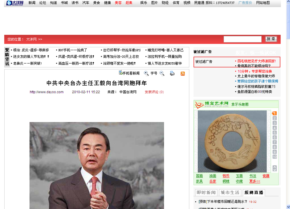 2010年2月11日,中共中央臺辦、國務(wù)院臺辦主任王毅通過中國臺灣網(wǎng)向臺灣同胞拜年。(中國臺灣網(wǎng) 田云鵬 攝)