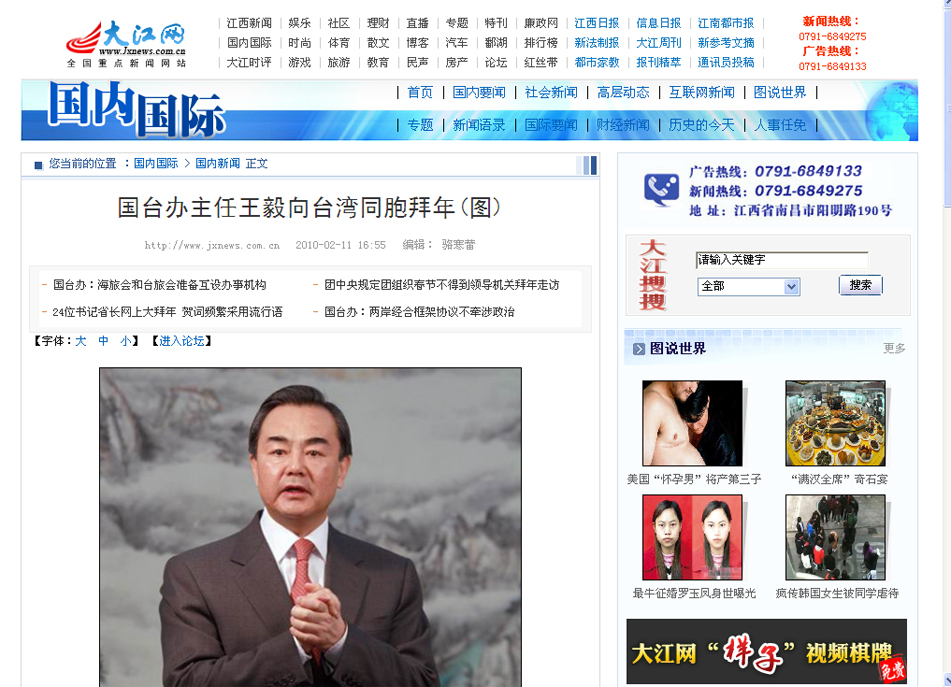 再過幾天,我們中華民族的傳統(tǒng)佳節(jié)——春節(jié)就要到了。值此兩岸同辭舊歲、共迎新春的喜慶時刻,我謹(jǐn)代表中共中央臺辦、國務(wù)院臺辦,通過中國臺灣網(wǎng),向海峽彼岸的2300萬臺灣同胞拜年!祝大家在虎年身體健康,生龍活虎;事業(yè)發(fā)達(dá),龍騰虎躍!