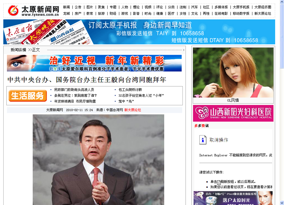 2010年2月11日,中共中央臺辦、國務院臺辦主任王毅通過中國臺灣網向臺灣同胞拜年。(中國臺灣網 田云鵬 攝)