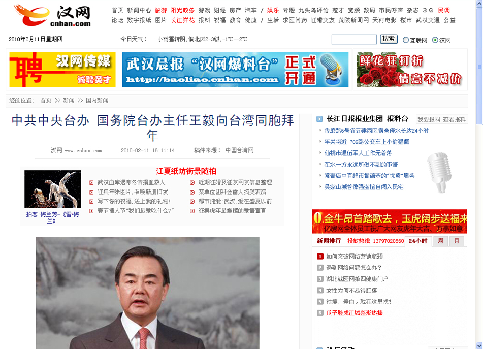 2010年2月11日,中共中央臺辦、國務院臺辦主任王毅通過中國臺灣向臺灣同胞拜年。(中國臺灣網 田云鵬 攝)