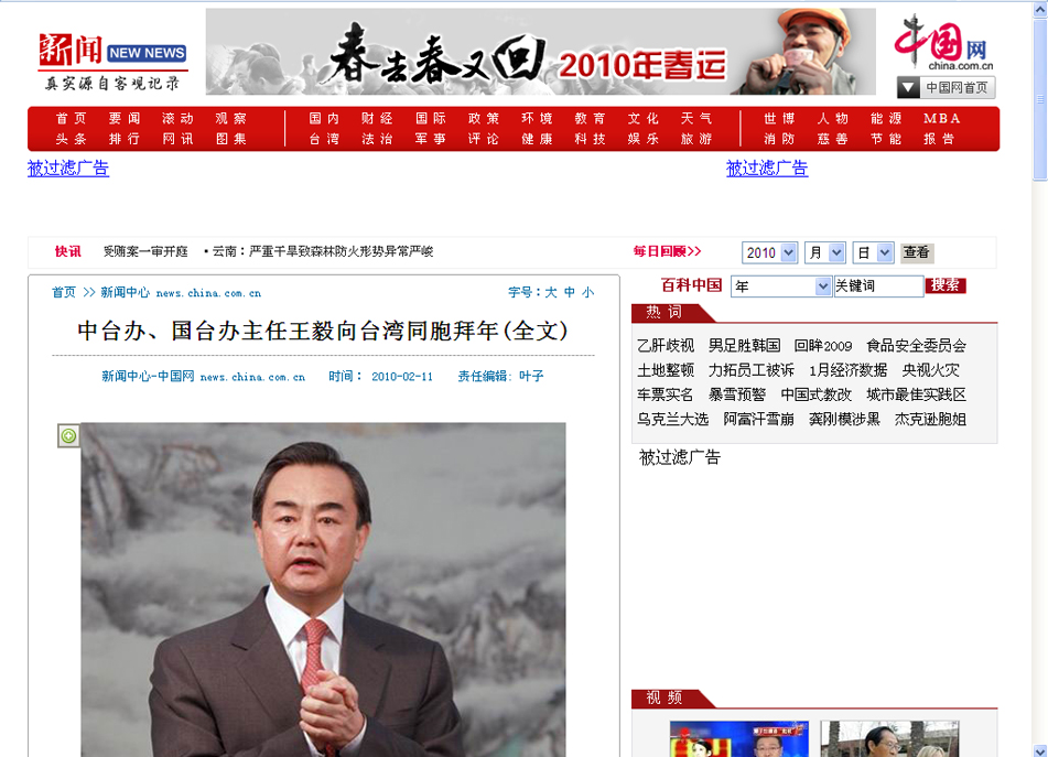 2010年2月11日,中共中央臺辦、國務(wù)院臺辦主任王毅通過中國臺灣網(wǎng)向臺灣同胞拜年。(中國臺灣網(wǎng) 田云鵬 攝)