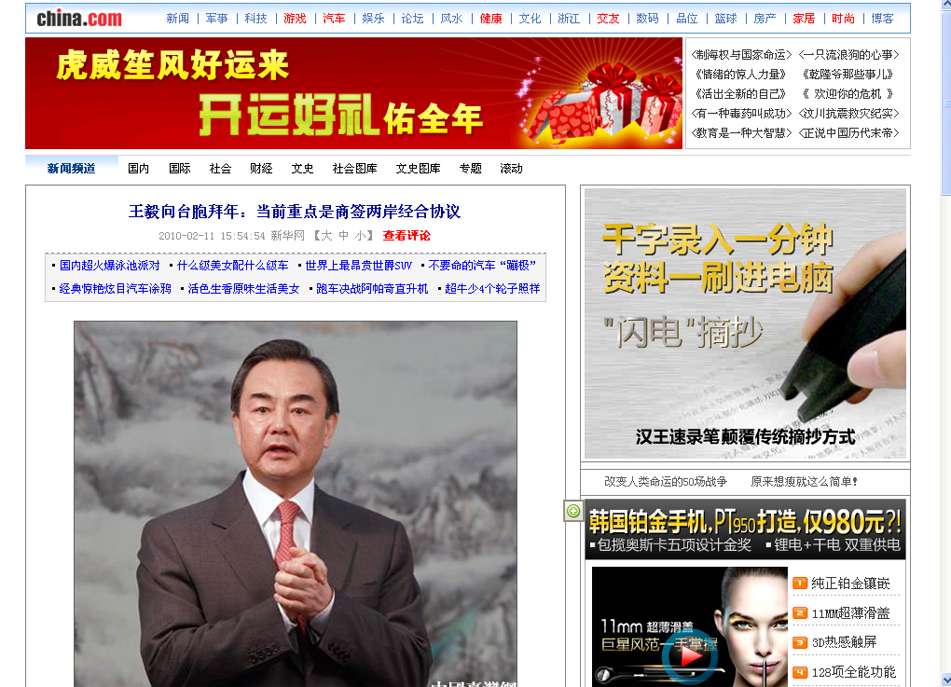 2010年2月11日,中共中央臺辦、國務院臺辦主任王毅通過中國臺灣網向臺灣同胞拜年。(中國臺灣網 田云鵬 攝)