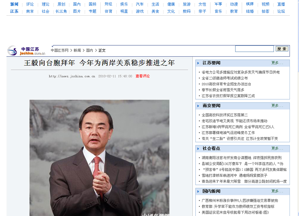 2010年2月11日,中共中央臺辦、國務院臺辦主任王毅通過中國臺灣網向臺灣同胞拜年。