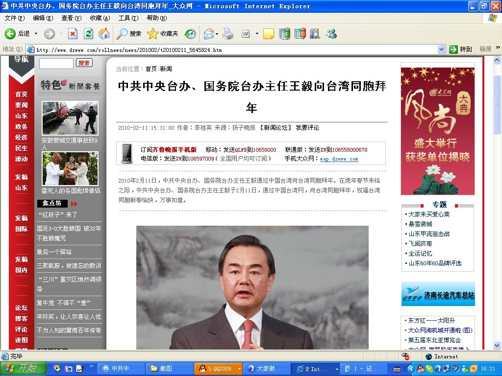 2010年2月11日,中共中央臺辦、國務院臺辦主任王毅通過中國臺灣網向臺灣同胞拜年。(中國臺灣網 田云鵬 攝)