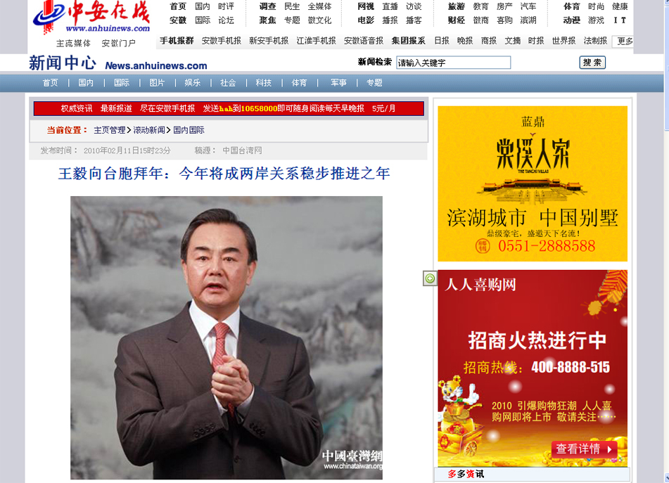 2010年2月11日,中共中央臺辦、國務(wù)院臺辦主任王毅通過中國臺灣網(wǎng)向臺灣同胞拜年。(中國臺灣網(wǎng) 田云鵬 攝)