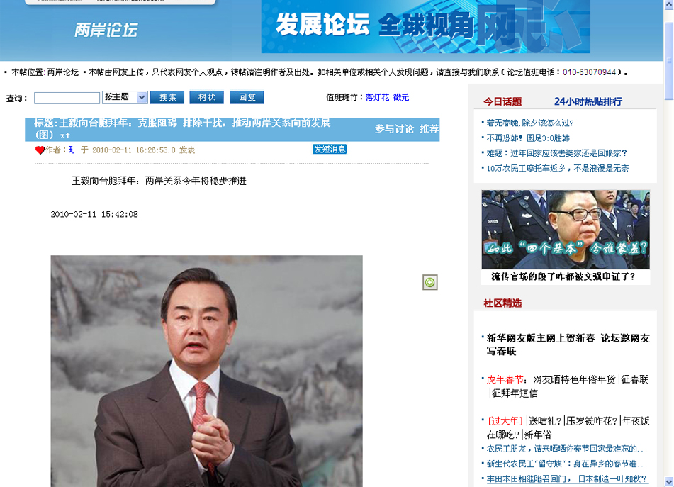 2010年2月11日,中共中央臺辦、國務院臺辦主任王毅向臺灣同胞拜年。(中國臺灣網)