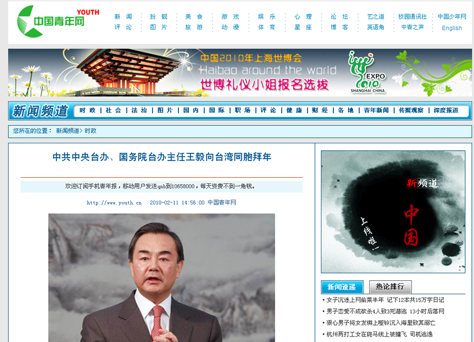 2010年2月11日,中共中央臺(tái)辦、國(guó)務(wù)院臺(tái)辦主任王毅通過中國(guó)臺(tái)灣網(wǎng)向臺(tái)灣同胞拜年。(中國(guó)臺(tái)灣網(wǎng) 田云鵬 攝)
