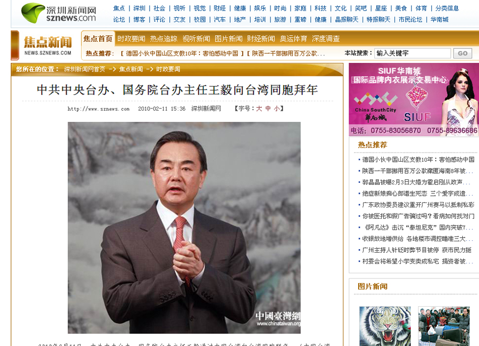 2010年2月11日,中共中央臺辦、國務院臺辦主任王毅通過中國臺灣網向臺灣同胞拜年。(中國臺灣網 田云鵬 攝)