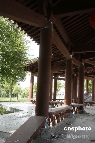 六月五日,四川江油李白故里被損壞的梁柱。受汶川地震影響,江油李白故居房屋全部拉裂,部分垮塌,清代建筑幾乎全部倒塌。有關文物部門初步估算,修復李白故里的費用可能達到三千萬至五千萬元人民幣。 中新社發 慎重 攝