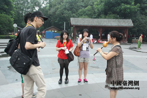 來自臺北海洋技術學院的曹瑞、李光麒、李欣芳、許宴萍對葫蘆絲很感興趣(中國臺灣網 李丹 攝)