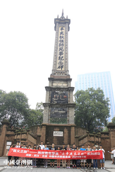 7月2日,“追尋歷史足跡”系列活動——首義之旅在成都拉開帷幕,來自臺灣十大杰出青年基金會成員與大陸大學生志愿者在成都人民公園——“辛亥革命紀念塔”一同合影(中國臺灣網(wǎng) 李丹 攝)
