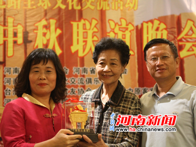 河南省客家聯誼會會長林雪梅(中)向臺灣客家親人(左一)贈送“中原圣土寶鼎”