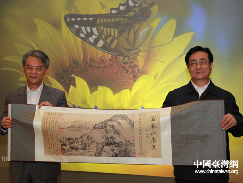 趙洪祝和蔡清彥交換禮物(浙江臺(tái)辦 王健 攝)