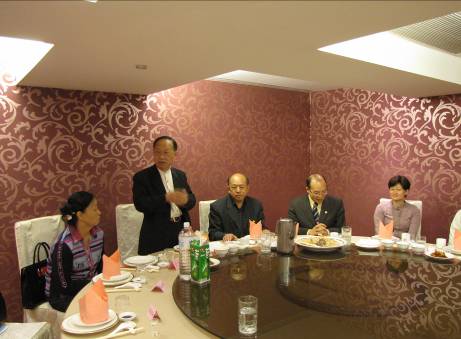11月19日中午,饒德俊先生以個人名義在高雄市宴請了訪問團一行,他在致歡迎辭中說,長期以來,我致力于兩岸文化交流,2009年要組織臺灣貴州同鄉會及有關文化藝人的書畫作品到貴州展覽,今后要擴大到黔臺經貿合作,將來還要考慮黔臺科技合作,為貴州的發展和黔臺合作做更多的事。在場的臺灣貴州同鄉會常務理事袁永壽先生在致辭中說,“饒德俊先生積極奔走,為促進兩岸交流開創了新的局面。饒先生將會一如既往作出努力。” 饒先生是我省思南人,情系家鄉,回報桑梓,在15日的晚宴上和當天,耄耋老人的他,還忙里忙外、熱情接待,緩步走到我們面前敬酒,將名片分發給我們,噓寒問暖,細致入微,讓人感動,令人欽佩。23日早晨,在我們即將離開賓館前往桃園機場乘飛機經香港轉機回貴州之際,專門到賓館為我們送行。由于知道我在貴州省黃埔軍校同學會機關工作,還特地請臺灣黃埔老兵林先生一同為我們送行。在貴州時,我曾多次見到饒先生,省黃埔軍校同學會也曾多次接待過他。在我眼里,饒先生是一位平易近人的老人。