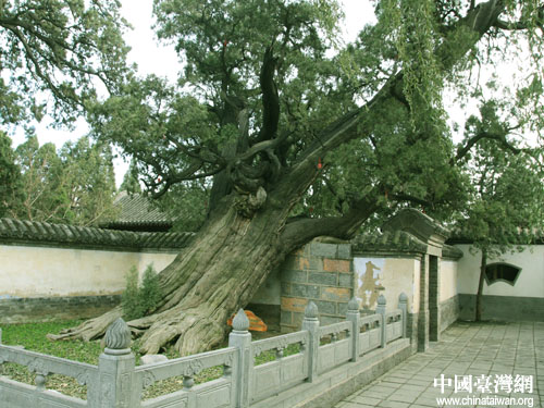 圖為“大將軍柏”。在嵩陽書院的東側,有一侏高大無比的古柏,其樹齡均在4000年以上,是中國現存最古老的柏樹。漢封將軍柏原有三棵,是漢武帝游嵩山時因見樹高大而封之為大將軍柏,二將軍柏和三將軍柏。三將軍柏清初被火燒毀,現存大將軍柏和二將軍柏。(中國臺灣網 徐維彬 攝)