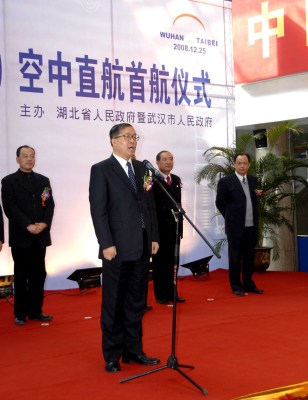 12月25日中午,武漢天河機場舉行了熱烈而隆重的武漢至臺北直航首航儀式。湖北省、武漢市領導中國東方航空公司等相關部門的領導及嘉賓共200余人參加了首航儀式。湖北省省長李鴻忠宣布武漢至臺北空中直航正式開通。(武漢臺辦、中國臺灣網聯合發稿)