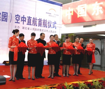 湖北省李鴻忠省長、田承忠副省長、武漢市阮成發市長、全國臺企聯何世忠常務副會長、中國東方航空集團公司陳海鞠副總裁為首航儀式剪彩  攝影:嚴越培
