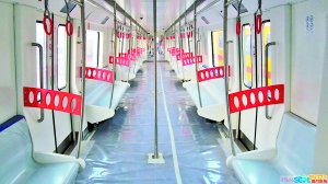 ■車(chē)內(nèi) 座椅和輕軌二號(hào)線車(chē)輛相同,均為靠窗設(shè)置,乘客對(duì)坐,采用不銹鋼材質(zhì)。有專門(mén)的殘疾人座位。座位比輕軌二號(hào)線更有流線感。