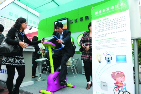 昨日,人民廣場(chǎng),第四屆中國(guó)專(zhuān)利周上展出的健身發(fā)電車(chē)。 記者 鄒飛 攝