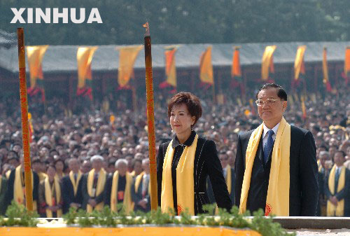 4月19日,中國國民黨榮譽主席連戰及夫人在河南新鄭市參加丁亥年黃帝故里拜祖大典。 新華社記者 邢廣利 攝