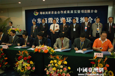 在今天海峽兩岸農業合作成果展覽暨推介會開幕式之后,簽約儀式會場傳來了捷報。由山東省棲霞市招商引資促進局和大中華國際投資管理集團(控股)有限公司就成立山東百佳(暫定)國際農產品交易物流中心達成協議,今天早上9:50雙方正式簽約。該項目主要包括農產品物流項目、中華農學村項目、桔桿發電項目、香草種植加工業務四項。其中,農產品交易中心項目總投資約2.8億美元,項目公司注冊資金5000萬美金。(謝曉萍 云鵬/圖)