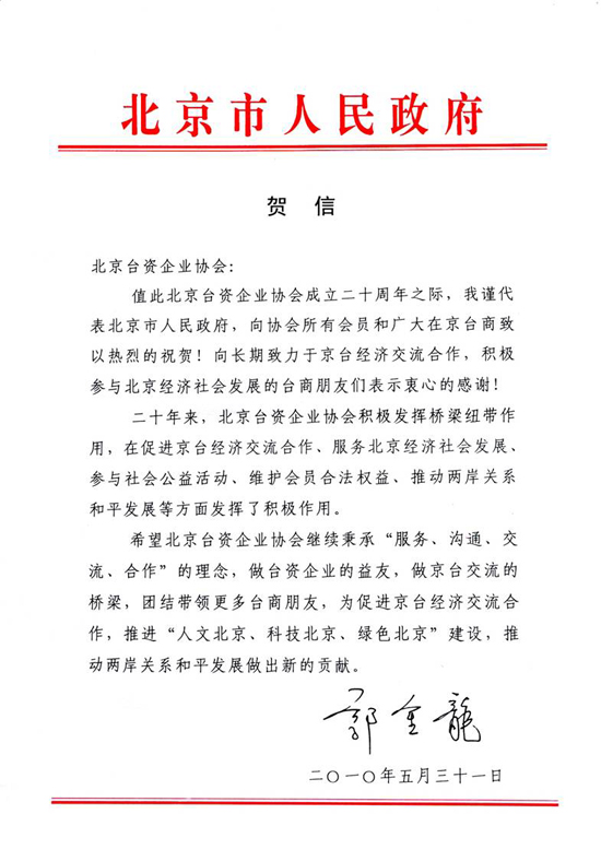 北京市委副書記、市長郭金龍的賀信