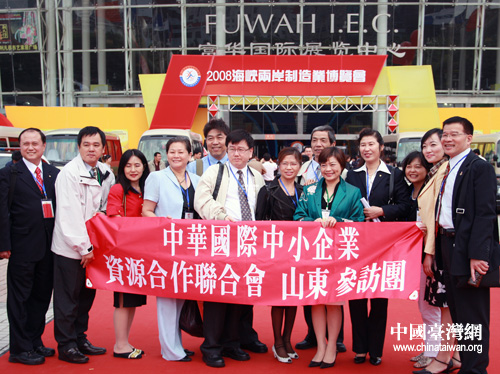 臺灣中小企業參訪團在海峽兩岸制造業博覽會展館前合影。(攝影:董潔)