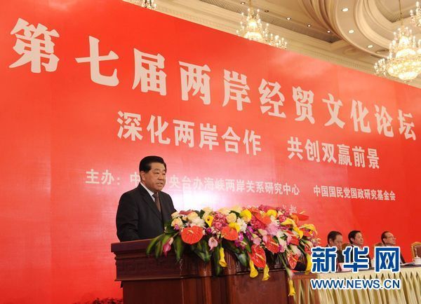 5月8日,第七屆兩岸經貿文化論壇在四川成都閉幕。中共中央政治局常委、全國政協主席賈慶林和中國國民黨榮譽主席吳伯雄出席閉幕會。這是中共中央政治局常委、全國政協主席賈慶林致辭。新華社記者 饒愛民 攝
