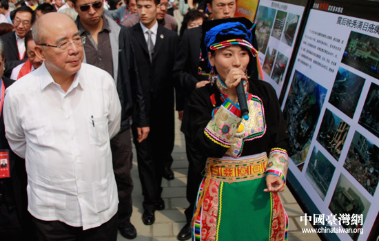 今日上午,國民黨榮譽主席吳伯雄率領前來參加兩岸經貿文化論壇的百余臺灣嘉賓前往汶川映秀鎮、水磨鎮考察災后重建情況。圖為吳伯雄參訪映秀鎮并聽取相關人員介紹災后重建情況。(中國臺灣網 高斯斯 攝)