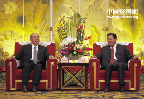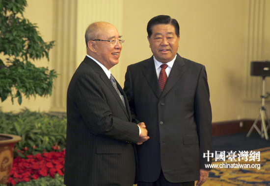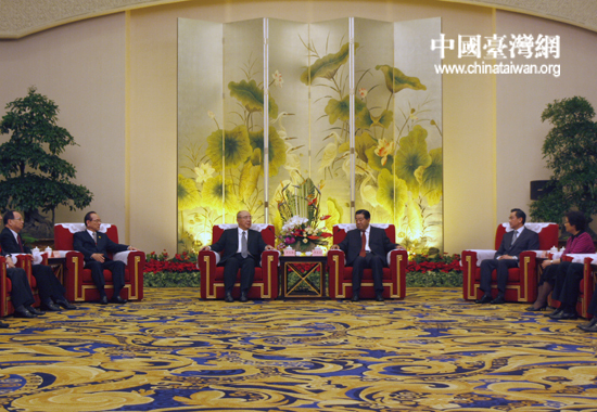 6日下午,中共中央政治局常委、全國政協(xié)主席賈慶林在成都會見中國國民黨榮譽主席吳伯雄和出席第七屆兩岸經(jīng)貿(mào)文化論壇的部分臺灣代表。(中國臺灣網(wǎng) 田云鵬 攝)