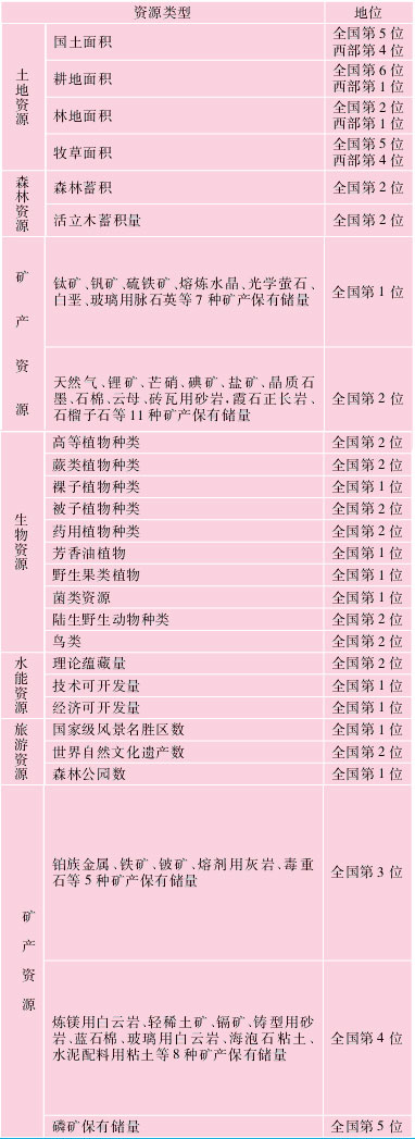 四川省礦產資源豐富且種類比較齊全,能源、黑色、有色、稀有、貴金屬、化工、建材等礦產均有分布。已發現各種金屬、非金屬礦產132種,占全國總數的70%;已探明一定儲量的有94種,占全國總數的60%,分布在全省大部分地區。有32種礦產保有儲量居全國前5位,其中鈦礦、釩礦、硫鐵礦等7種礦產居全國第一位。釩、鈦具有世界意義,鈦儲量占世界總儲量的82%,釩儲量占世界總儲量的1/3;天然氣、鋰礦、芒硝等11種礦產居全國第二位;鉑族金屬、鐵礦等5種居全國第三位;煉鎂用白云巖、輕稀土礦等8種礦產居全國第四位;磷礦居全國第五位。