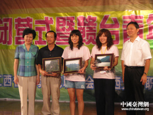 2010年全國臺聯臺胞青年夏令營江西分營7月15日下午在南昌舉行閉營式暨贛臺青年聯歡會。圖為江西省臺辦主任閻鋼軍、省統戰部常務副部長黃小華與獲獎選手合影。(圖片來源:江西省臺辦)