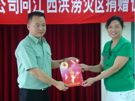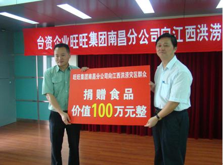 5月份以來,江西開始遭受強降雨襲擊,局部地區出現洪澇災害,給災區人民生命財產造成嚴重損失。捐贈儀式上,臺灣旺旺集團南昌分公司總監劉文剛代表集團公司向江西省受災較為嚴重的南昌、撫州和鷹潭三市捐贈了價值100萬元的食品。