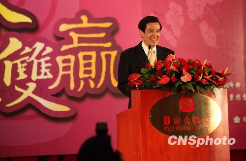 2月22日上午10時,由臺灣海基會、“陸委會”、“經濟部”、工業總會、商業總會聯合舉辦的“2010大陸臺商春節聯誼活動”在臺北舉行。會場主席臺上懸掛有“福虎迎春、合作雙贏”的大字。100多位大陸各地的臺商會長及200多位回臺灣過春節的臺商在會場就座。圖為馬英九親臨會場致詞。 中新社發 耿軍 攝