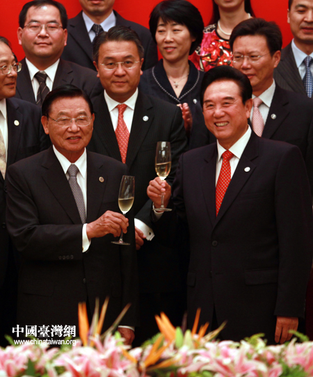6月29日下午,海協(xié)會與臺灣;鶗谥貞c順利簽署兩岸經(jīng)濟合作框架協(xié)議(ECFA)以及兩岸知識產(chǎn)權保護合作協(xié)議。圖為陳云林、江丙坤舉杯互致慶賀。(中國臺灣網(wǎng) 鐘寶華 攝)