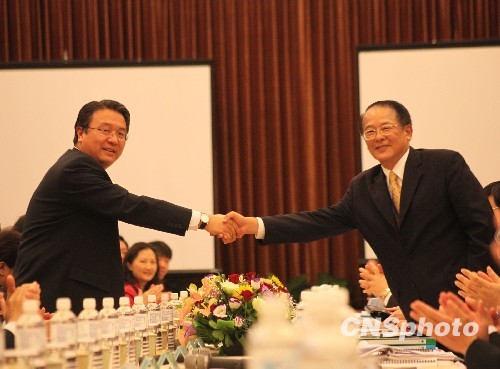 兩岸經(jīng)濟(jì)框架協(xié)議(ECFA)第二次協(xié)商3月31日在臺(tái)灣桃園縣鴻禧大溪?jiǎng)e館舉行。圖為會(huì)談開始時(shí)大陸方面主談代表商務(wù)部臺(tái)港澳司司長(zhǎng)唐煒與臺(tái)灣主談代表黃志鵬(右)握手。 中新社發(fā) 耿軍 攝