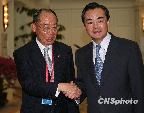 中共中央臺辦、國務院臺辦主任王毅,10日在海南博鰲為前來出席博鰲亞洲論壇2010年年會的臺灣兩岸共同市場基金會最高顧問錢復一行舉辦招待酒會。